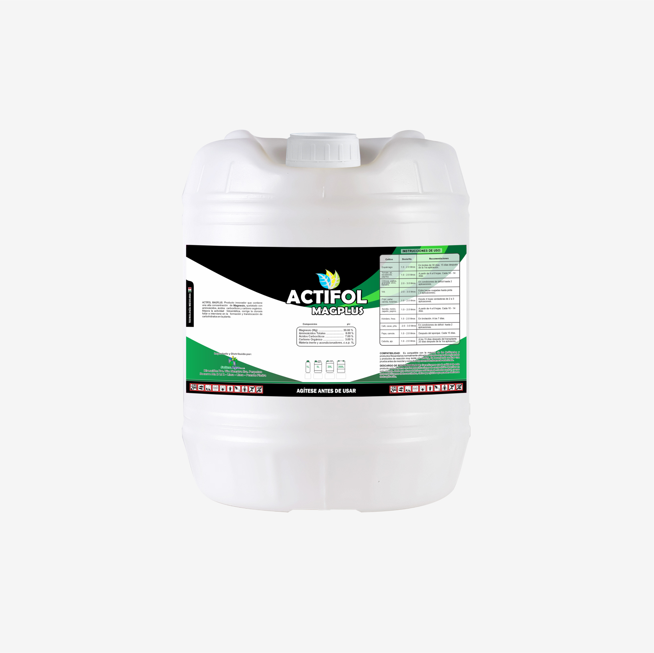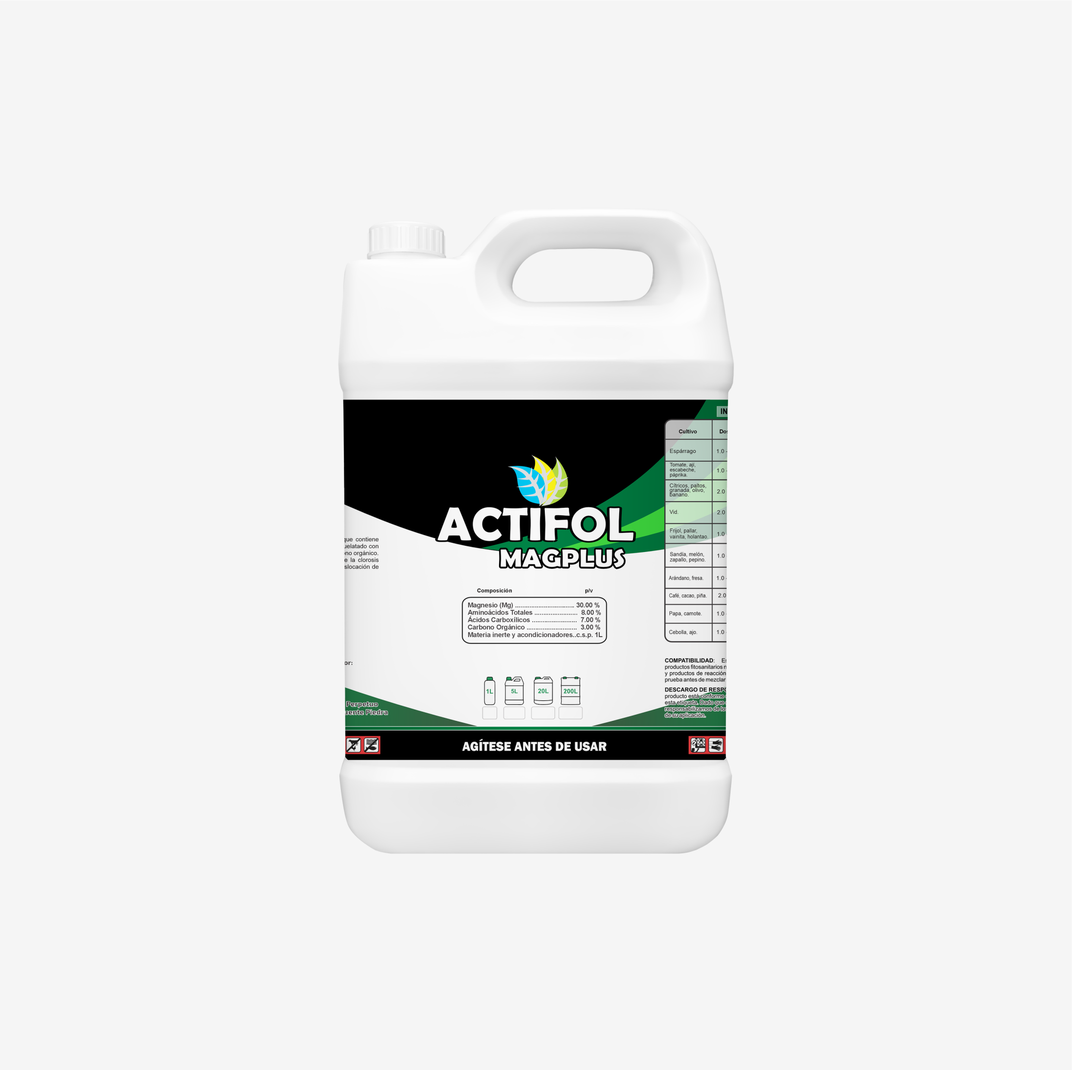 ACTIFOL MAGPLUS: Producto innovador que contiene una alta concentración de Magnesio, quelatado con aminoácidos, ácidos carboxílicos y carbono orgánico. Mejora la actividad fotosintética, clorosis foliar e interviene en la formación y translocación de carbohidratos en la planta.