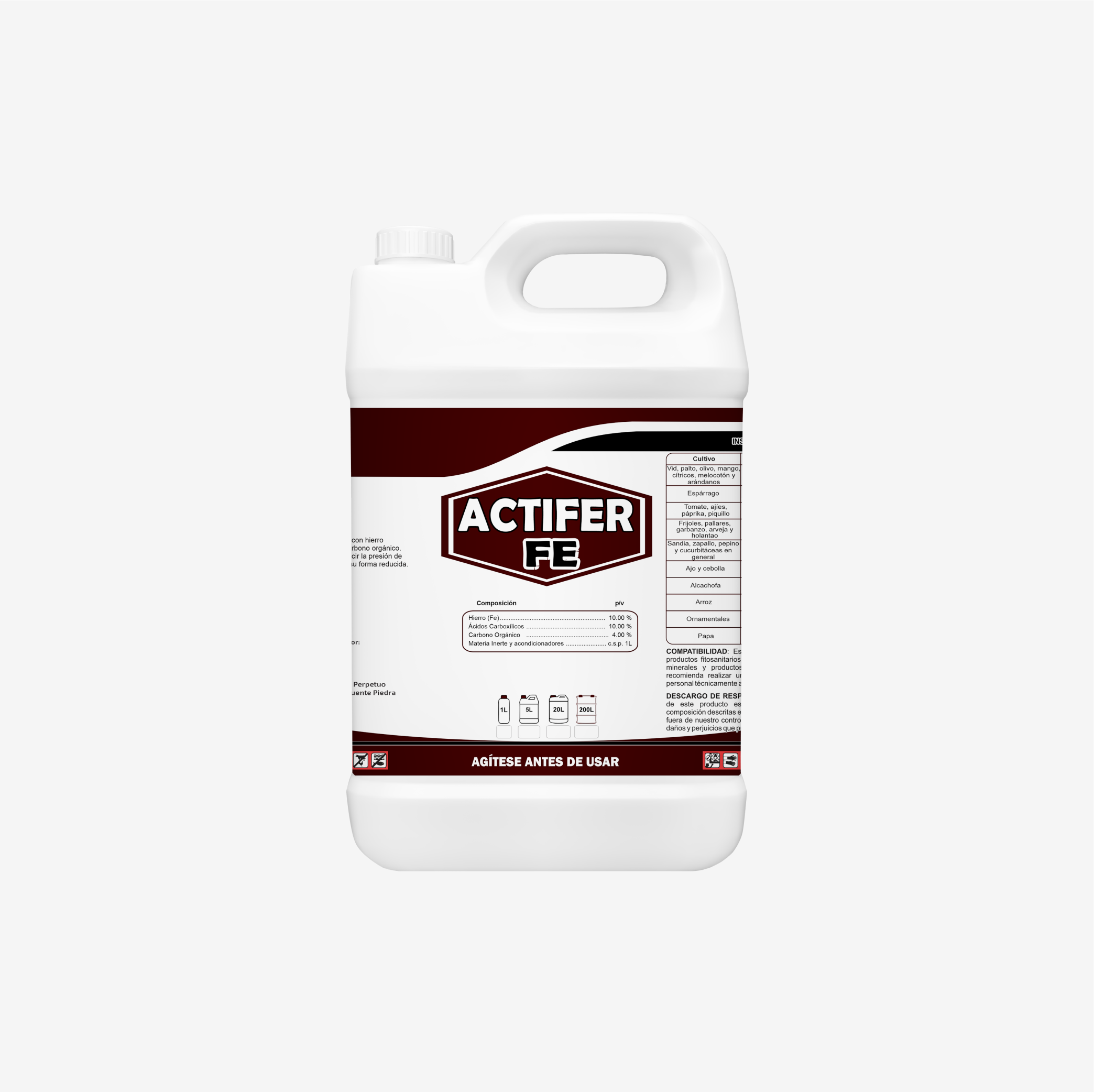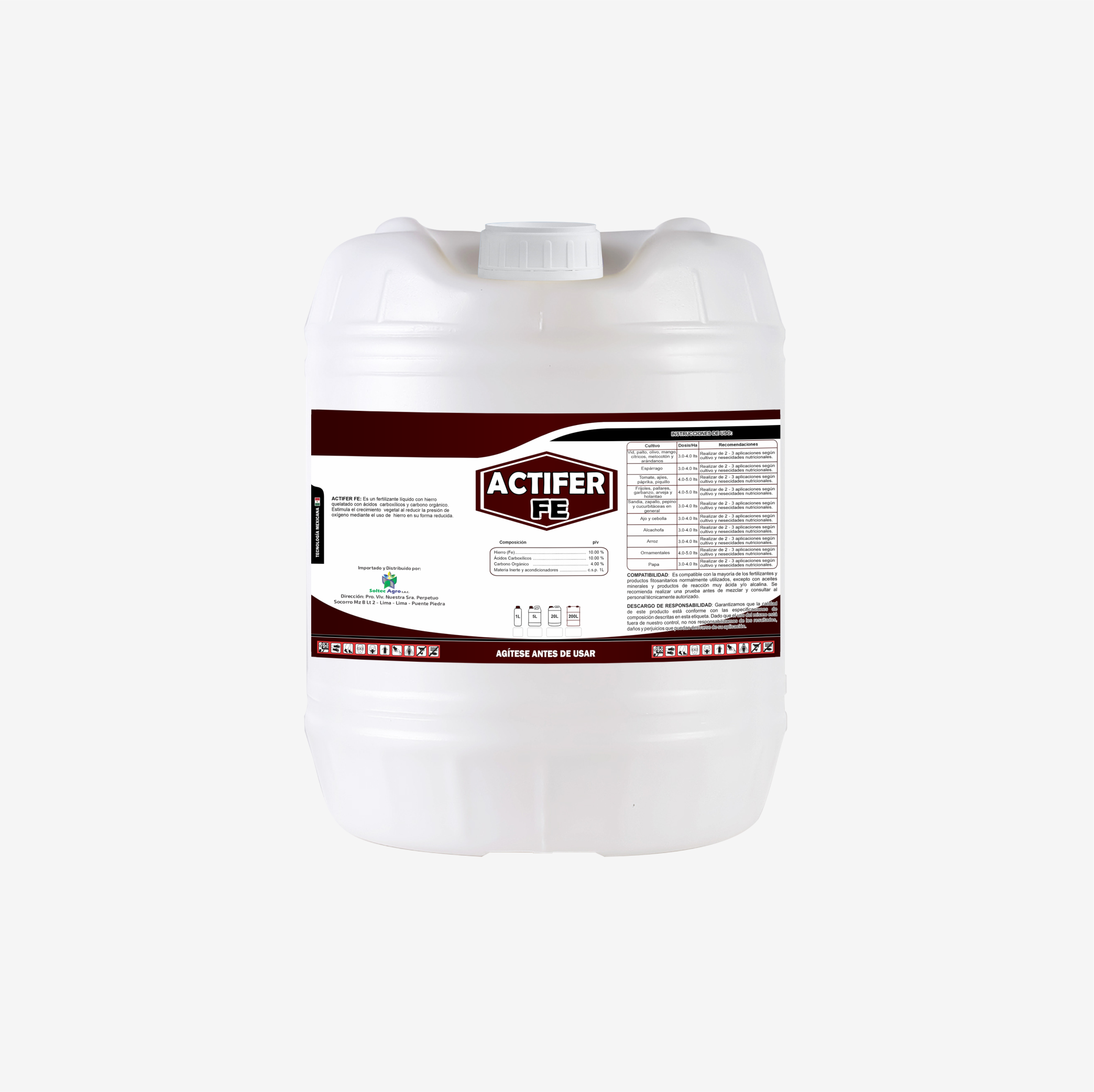 ACTIFER FE: Es un fertilizante líquido a base de una adecuada concentración de Hierro, quelatado con Ácidos Carboxílicos y Carbono Orgánico. Estimula y acelera el crecimiento de todo tipo de plantas, al reducir la presión parcial del oxigeno sobre las misma (por la utilización de Hierro en su forma reducida).