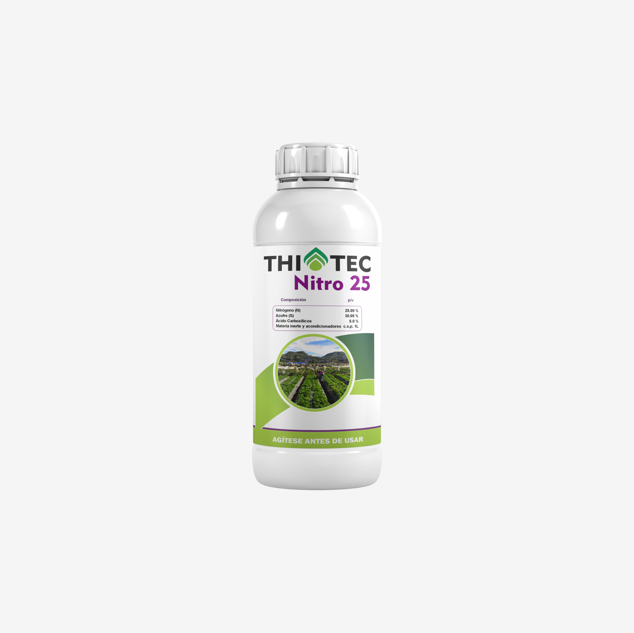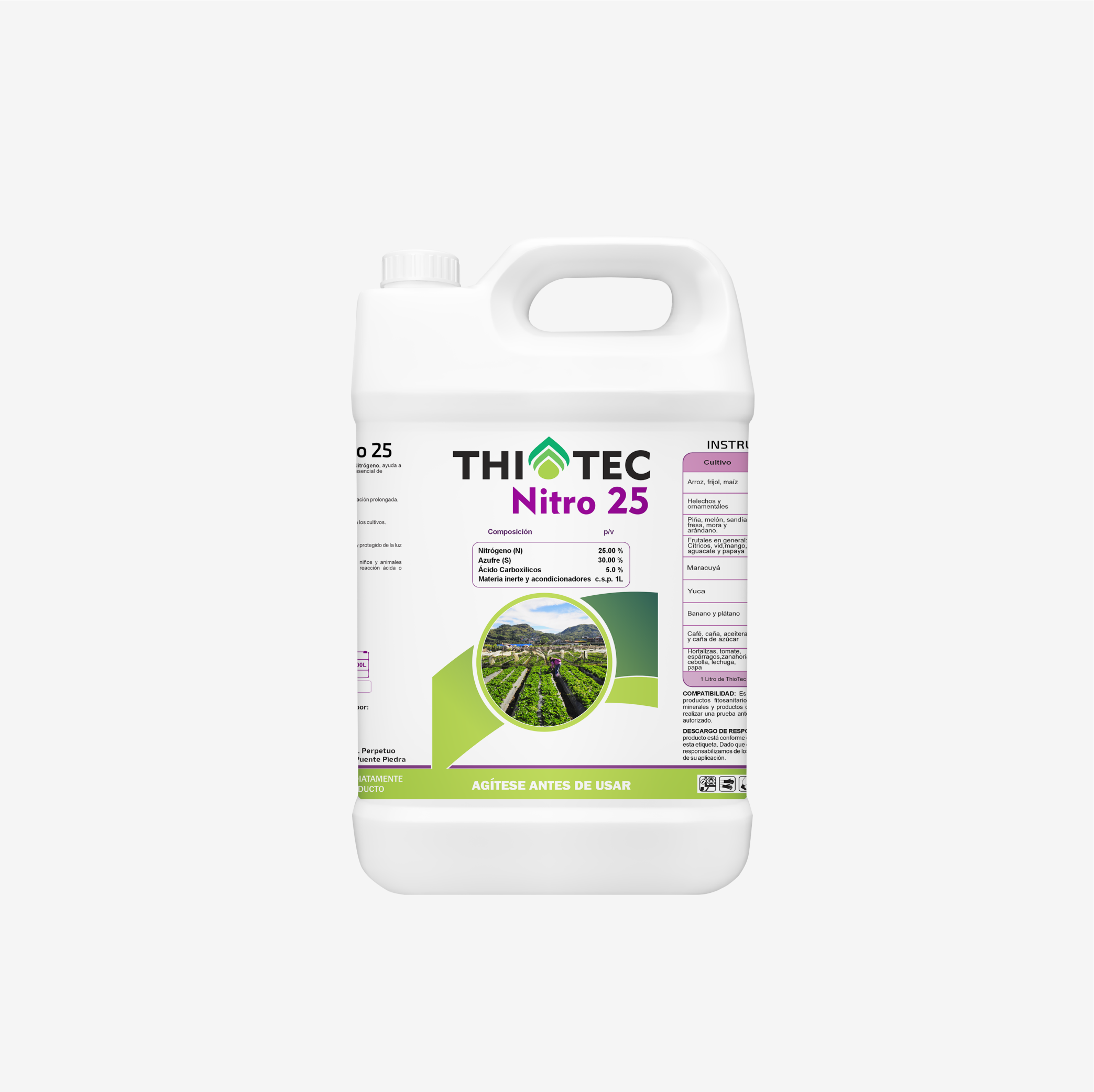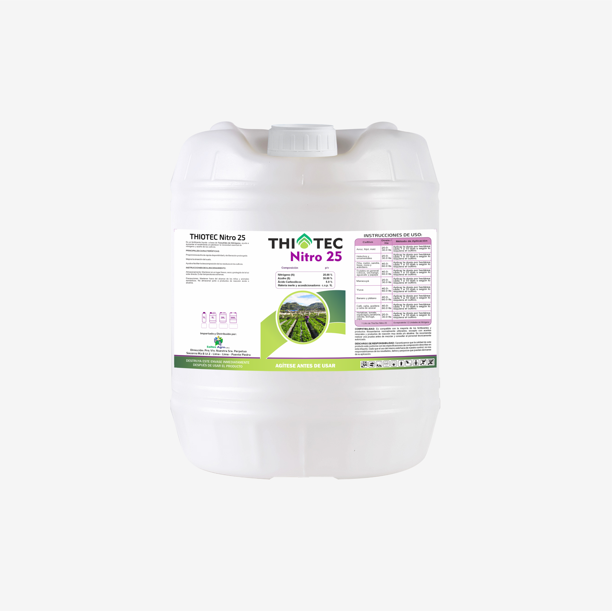 THIOTEC NITRO 25: Es un fertilizante líquido a base de Tiosulfato de Nitrógeno que contribuye a aumentar el rendimiento al satisfacer las necesidades esenciales de nitrógeno y azufre en los cultivos. Proporciona azufre de rápida disponibilidad y liberación prolongada, mejorando la aireación del suelo y facilitando la descomposición de los residuos de cultivo.