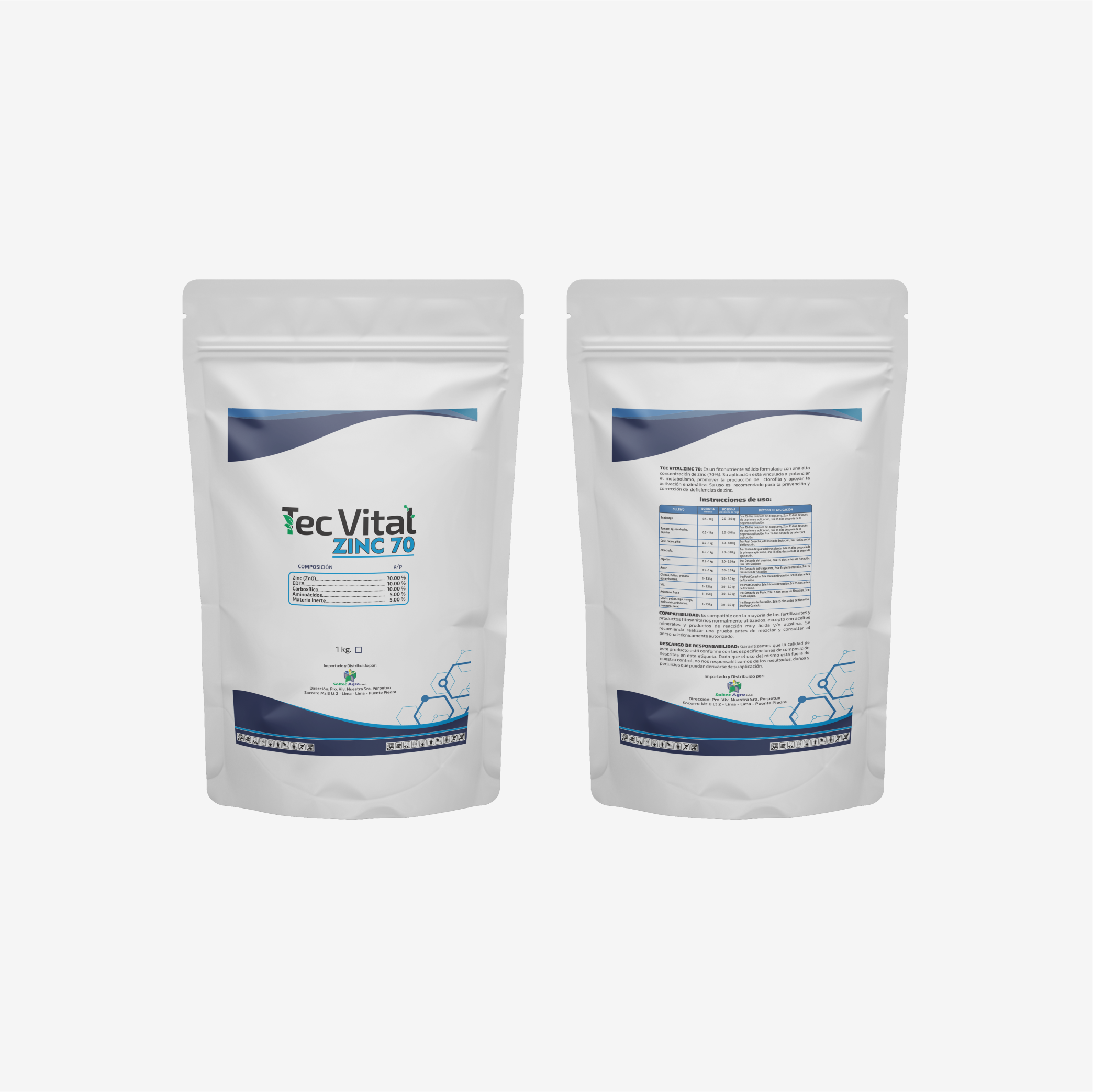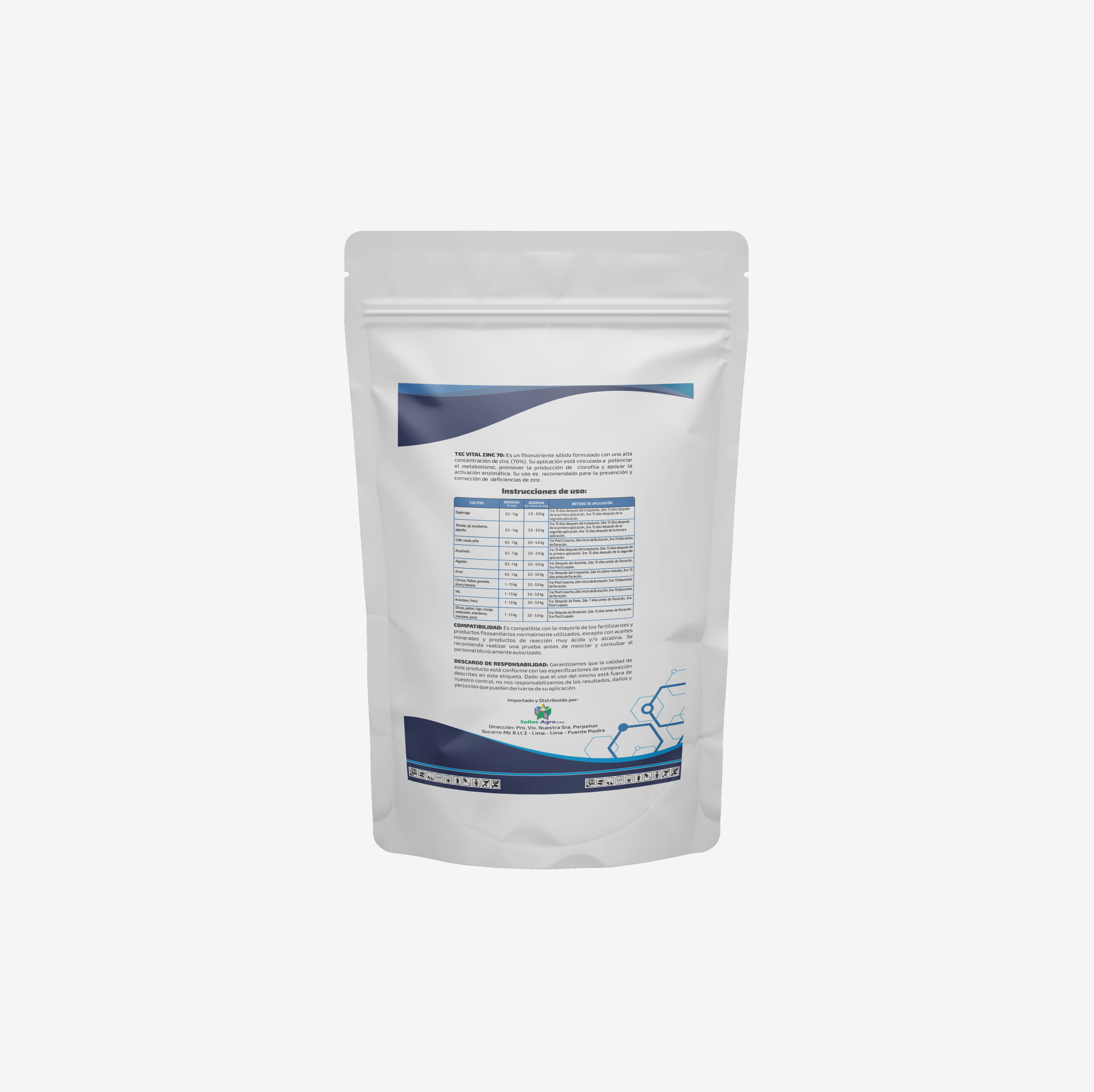 TEC VITAL ZINC 70: Es un fitonutriente sólido formulado con una alta concentración de Zinc (70%). Su aplicación se encuentra vinculada a potenciar el metabolismo, promover la producción de clorofila y apoyar la activación enzimática. Su uso es recomendado para la prevención y corrección de deficiencia de Zinc.